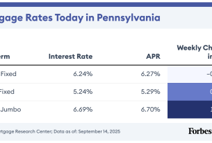 At today’s interest rate of 6.39%, borrowers with a 30-year fixed-rate refinance mortgage of $100,000 will pay $625 per month in principal and interest (taxes and fees not included), the Forbes Advisor mortgage calculator shows. You’d pay about $125,489 in total interest over the life of the loan.